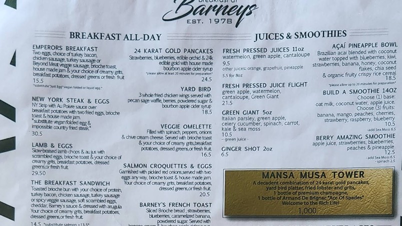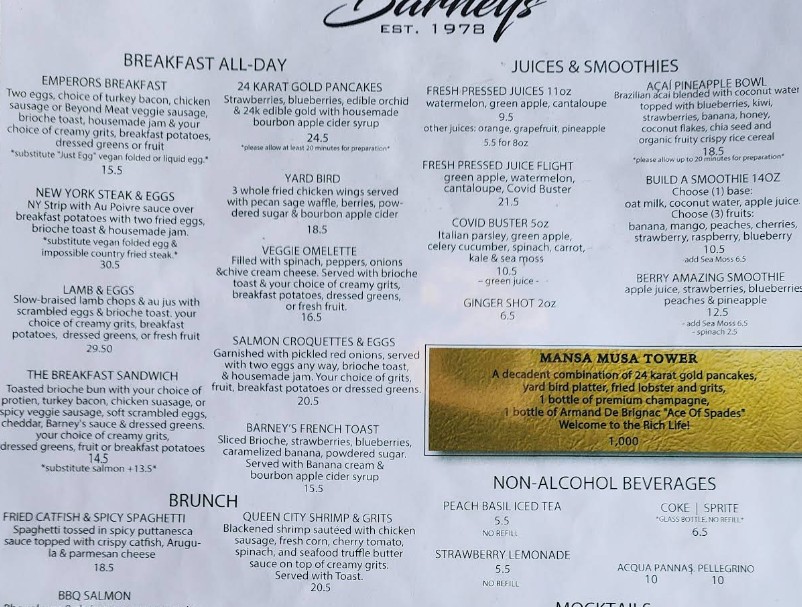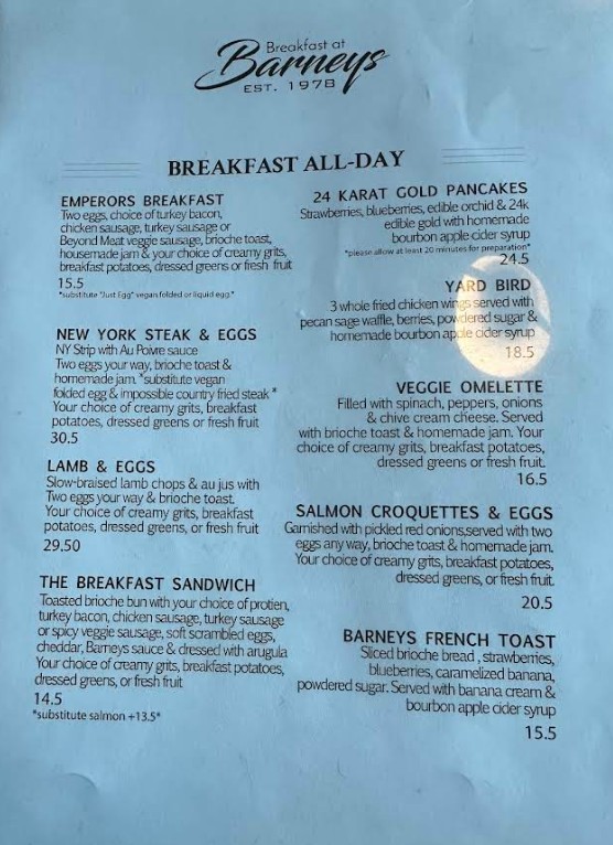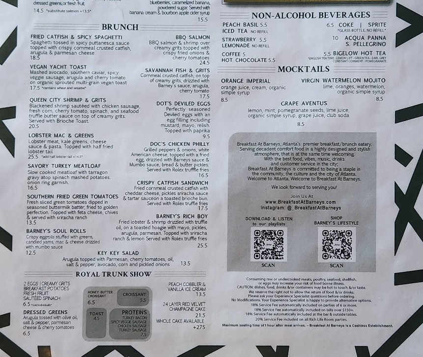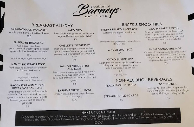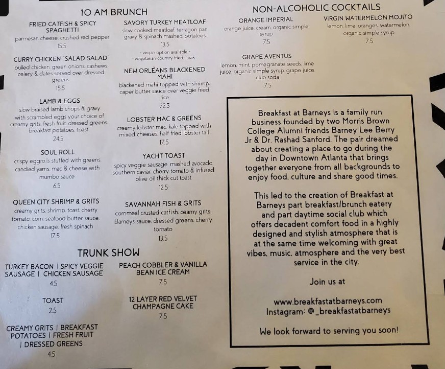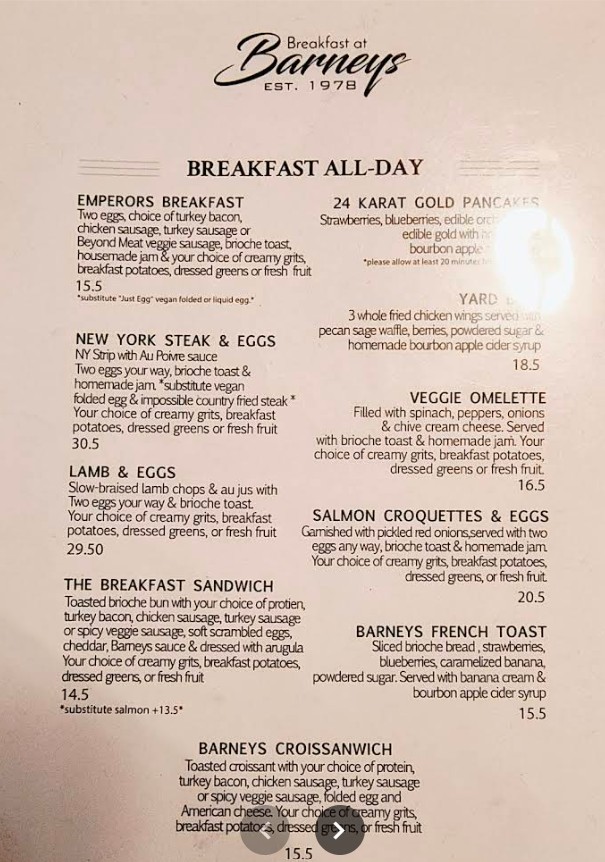 Looking for the latest Breakfast At Barney's Restaurant menu in Atlanta, GA? Discover a vibrant all-day brunch experience featuring Southern-inspired classics, signature breakfast plates, handcrafted cocktails, smoothies, and specialty coffee. Breakfast At Barney’s is known for its trendy atmosphere and bold flavors, offering everything from comfort food favorites to modern brunch creations. Browse the complete menu guide below to explore updated prices, popular dishes, and must-try specialties before your visit.
